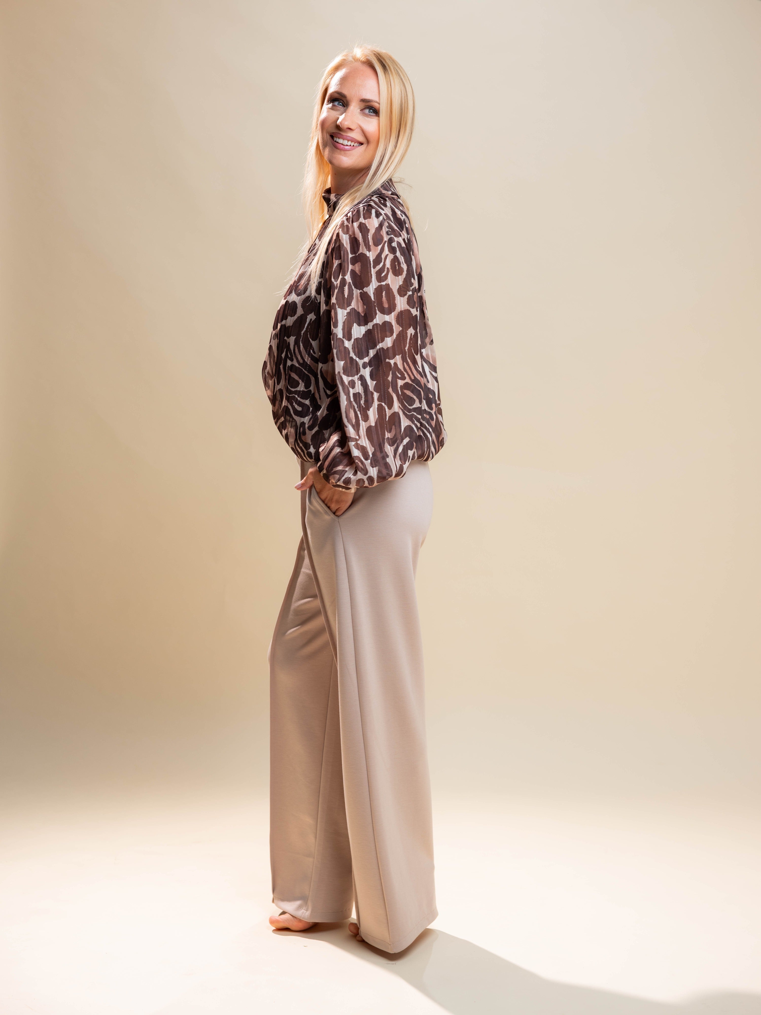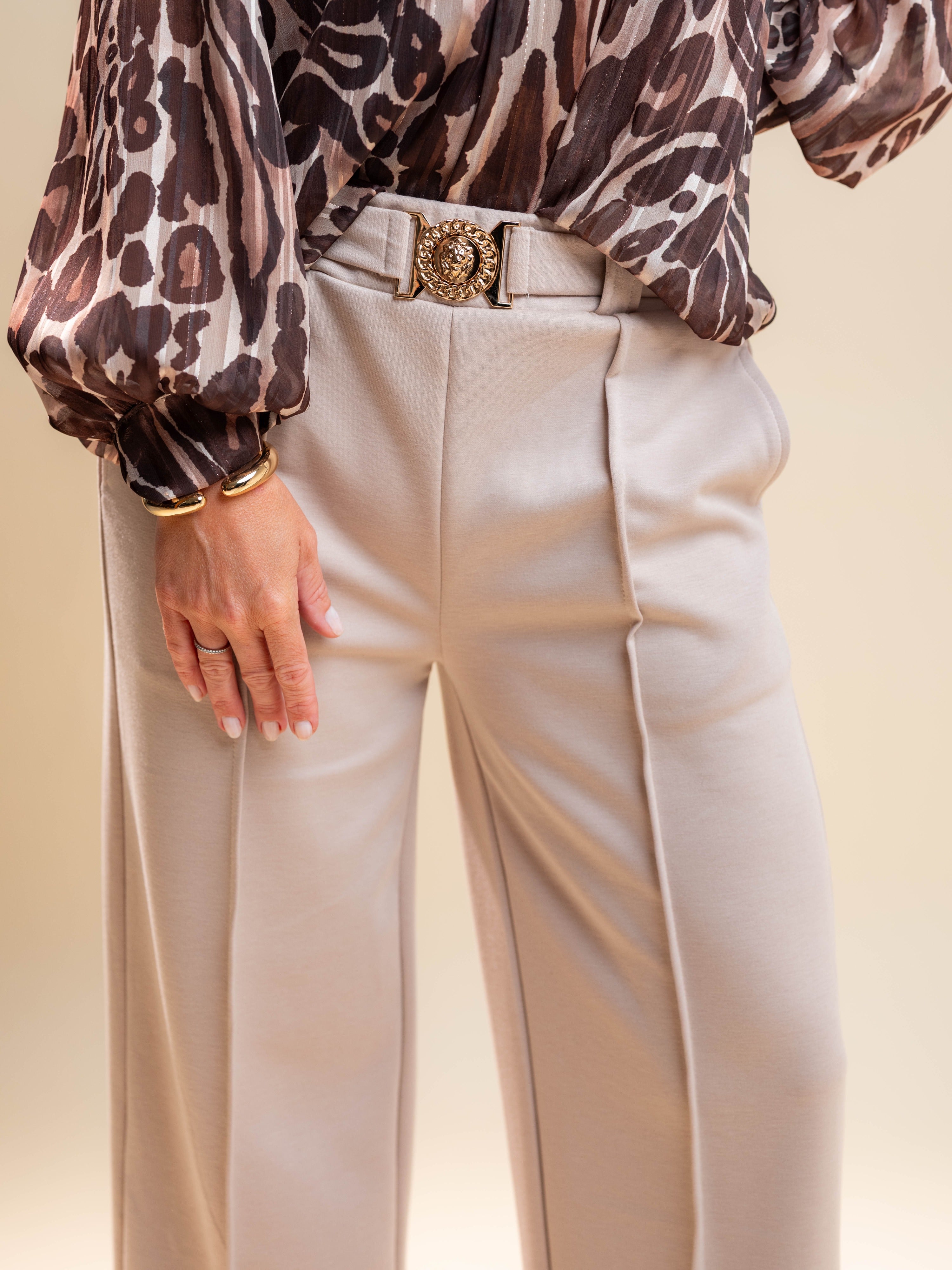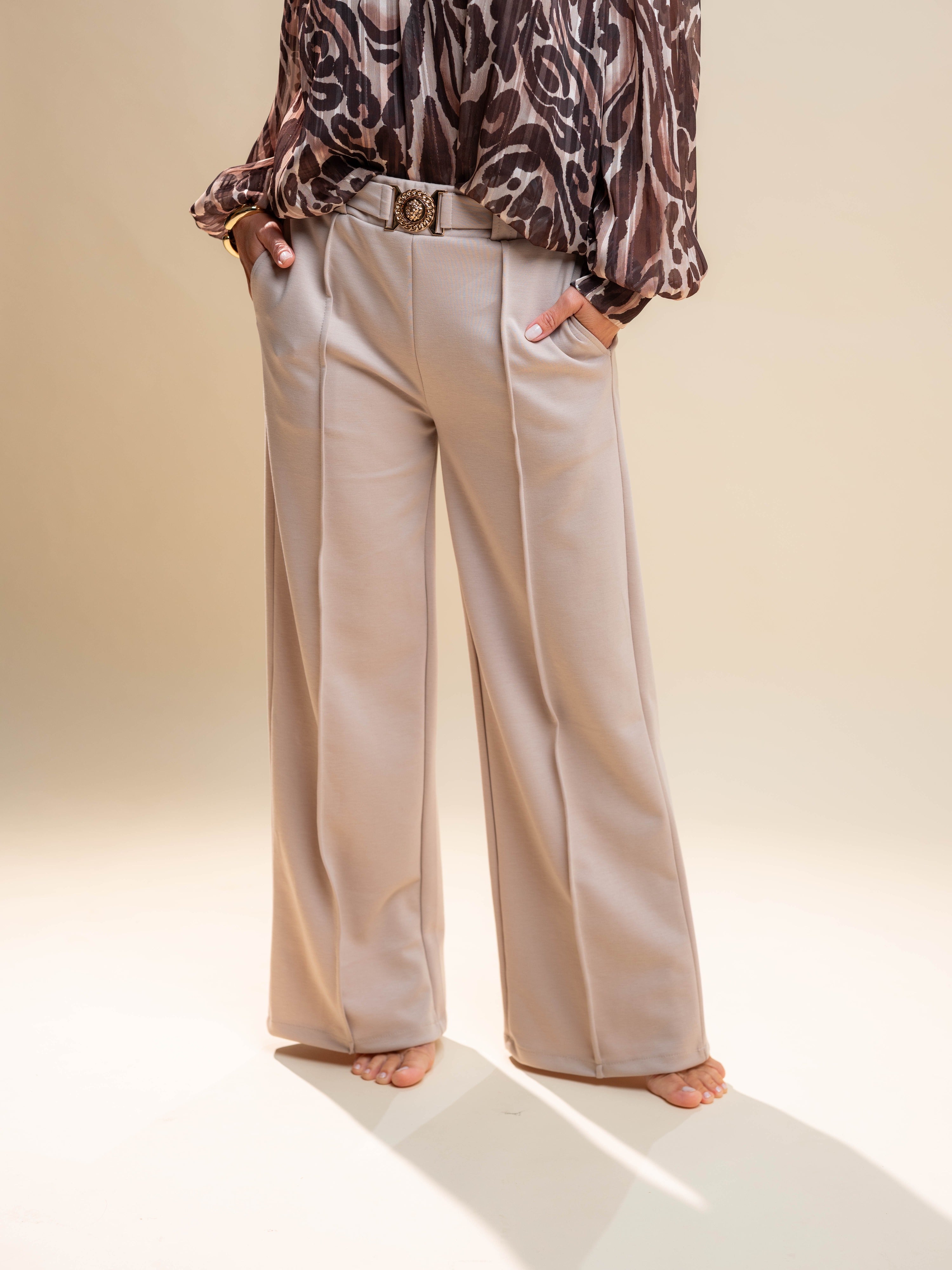 - Bež hlače z okrasnim pasom z zlatim elementom in žepi