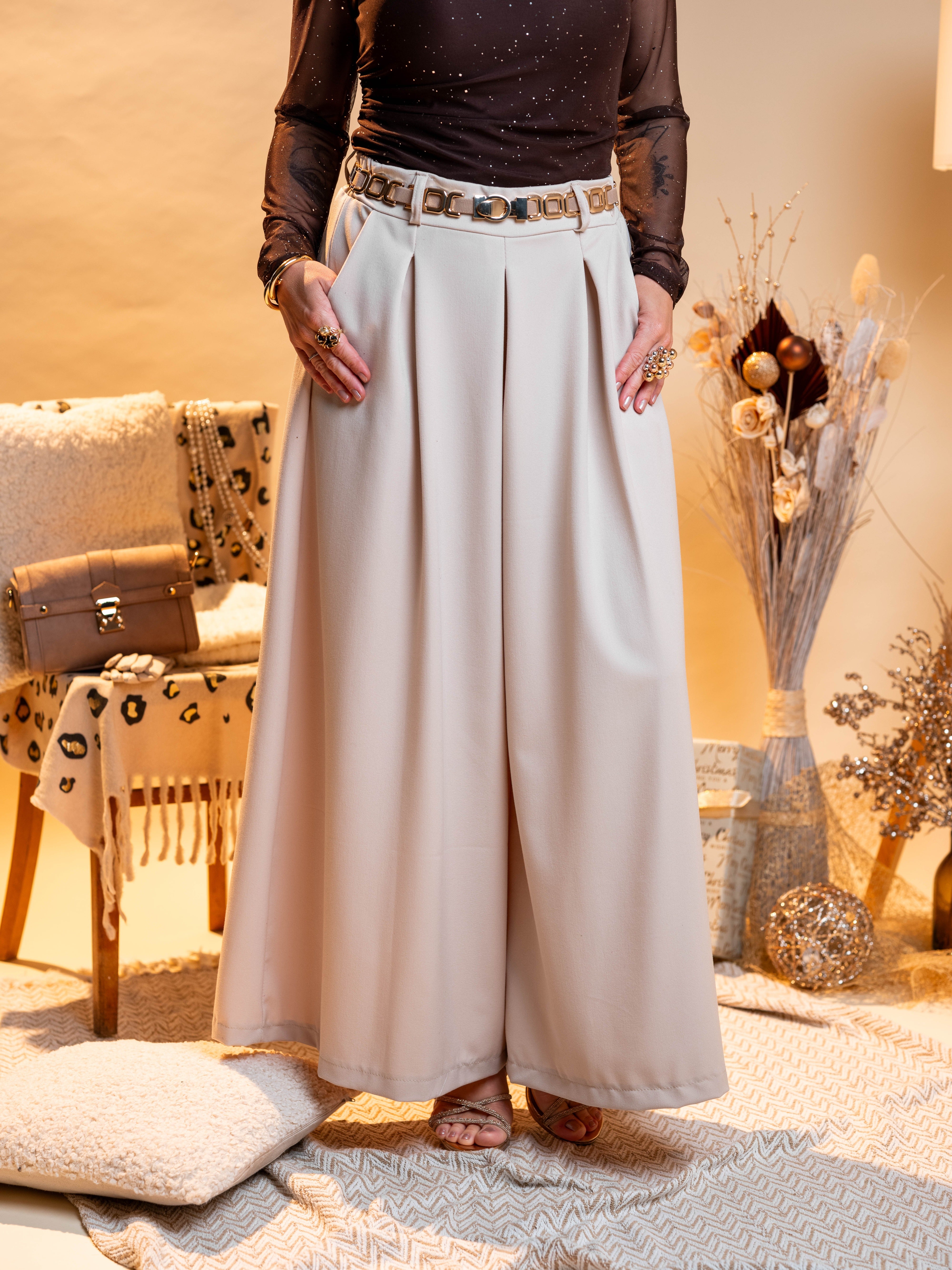 - Bež široke hlače s priloženim črnim okrasnim pasom