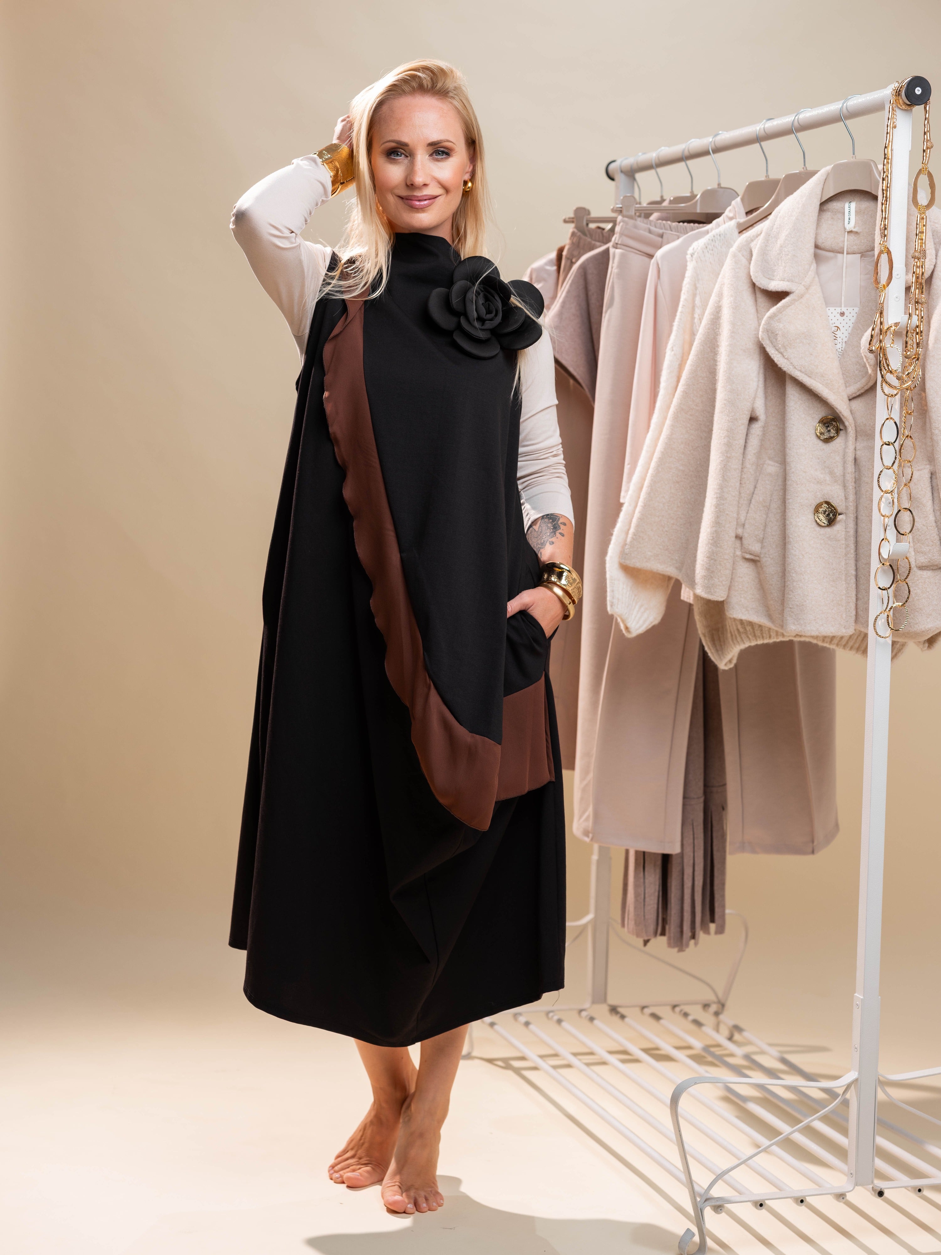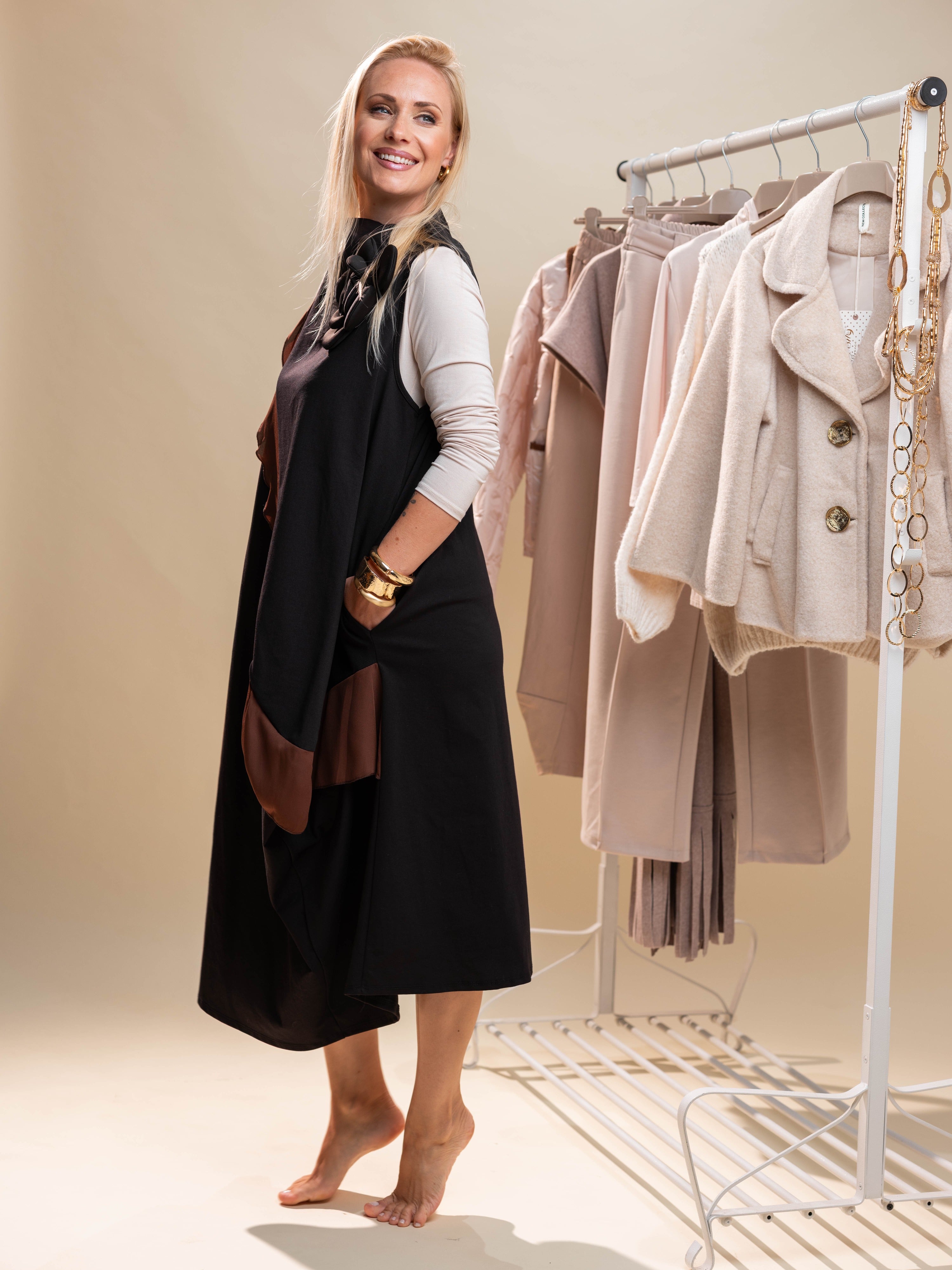 • Črna obleka brez rokavov z rjavim vzorcem in žepi
