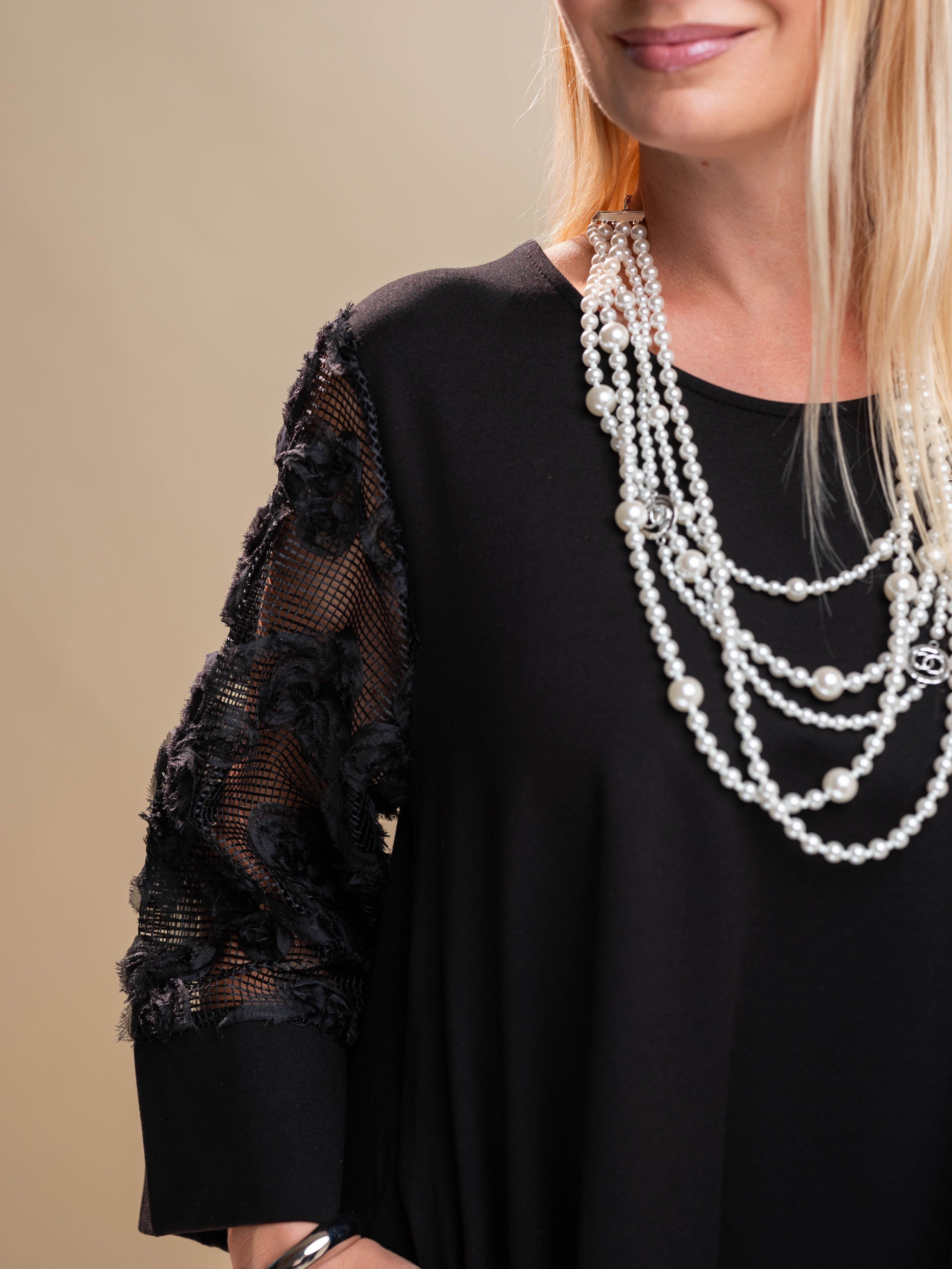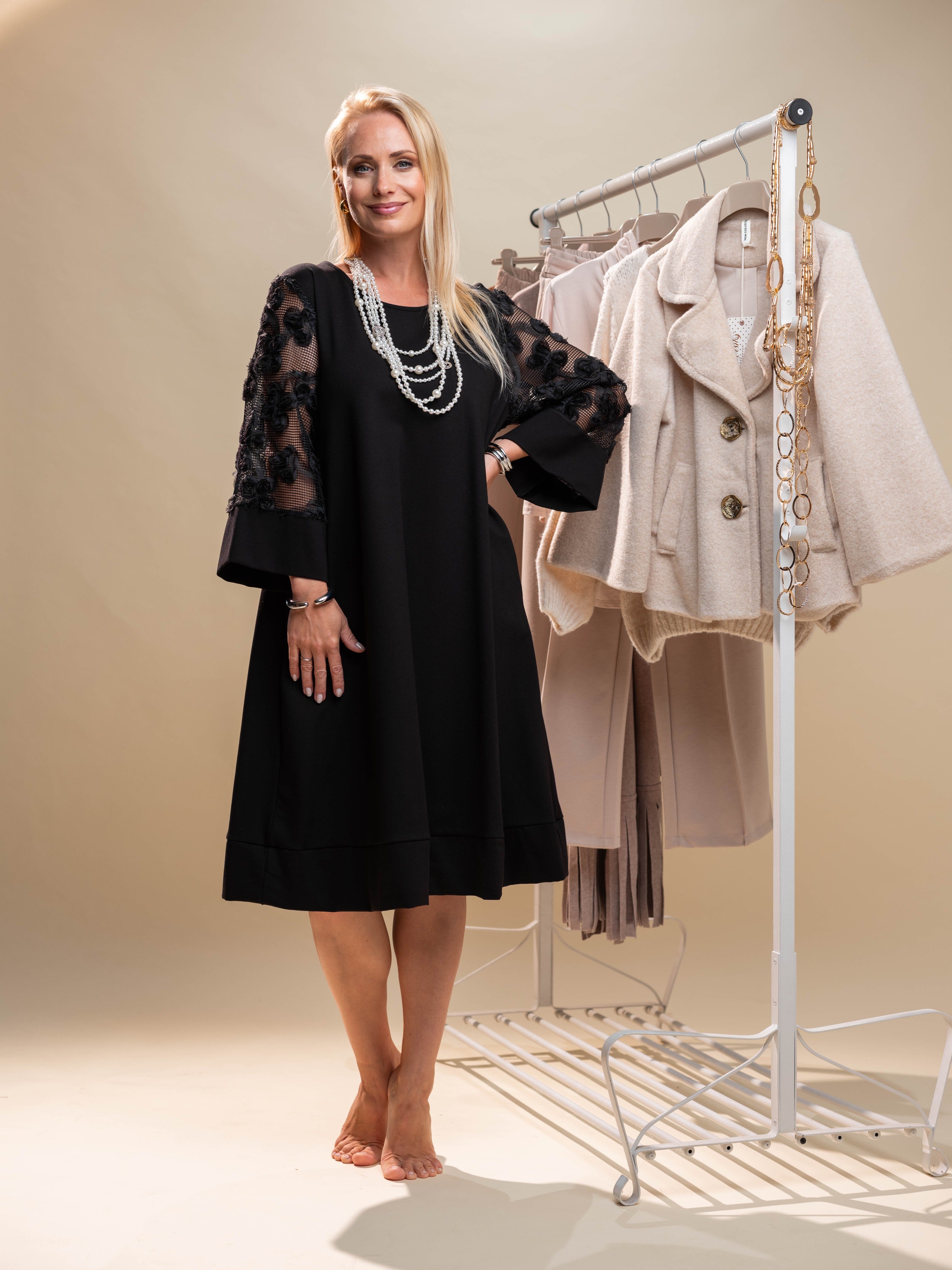 Obrazec izdelka Črna obleka s prosojnimi rokavi €59,10 DDV je že vključen v ceno. Količina Dodaj v košarico