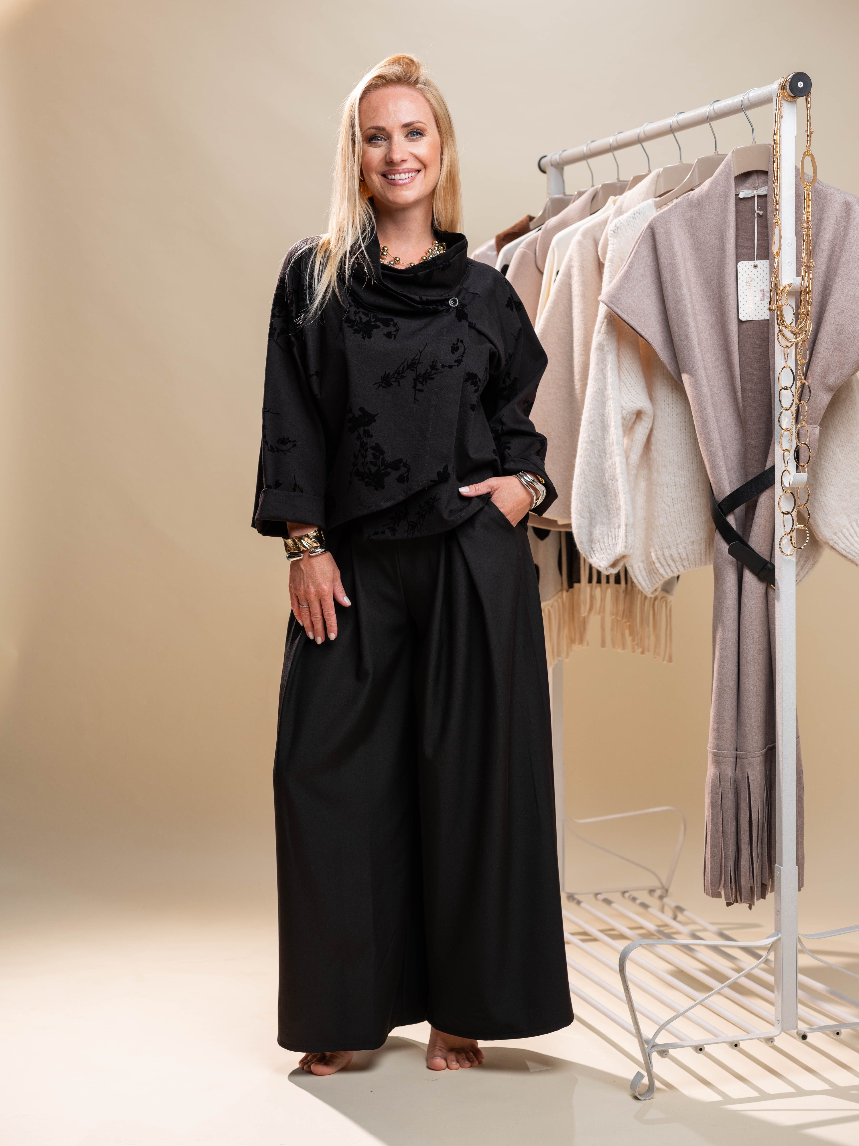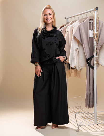 Obrazec izdelka Črne široke hlače s črnim pasom €35,50 DDV je že vključen v ceno. Količina Dodaj v košarico