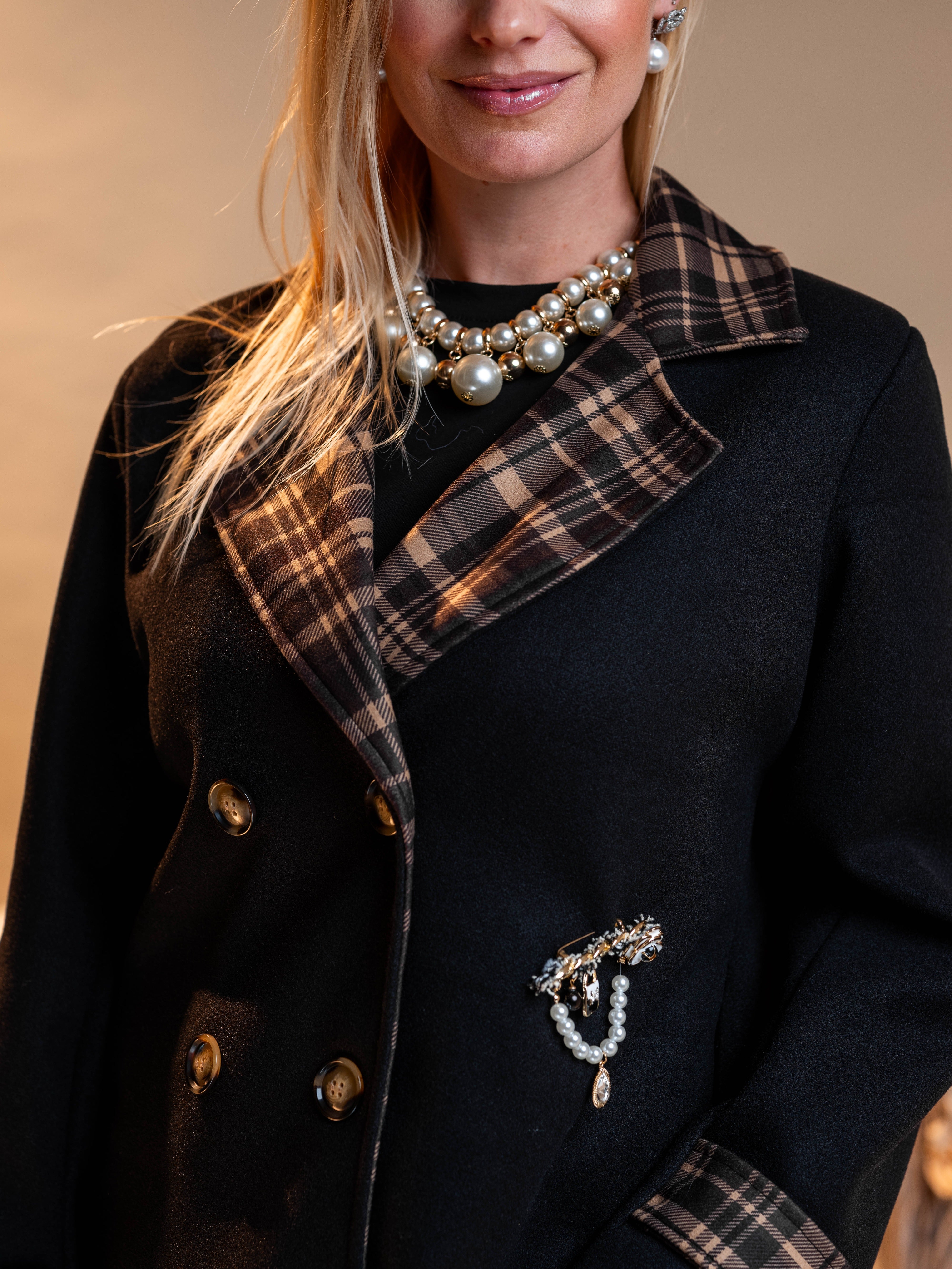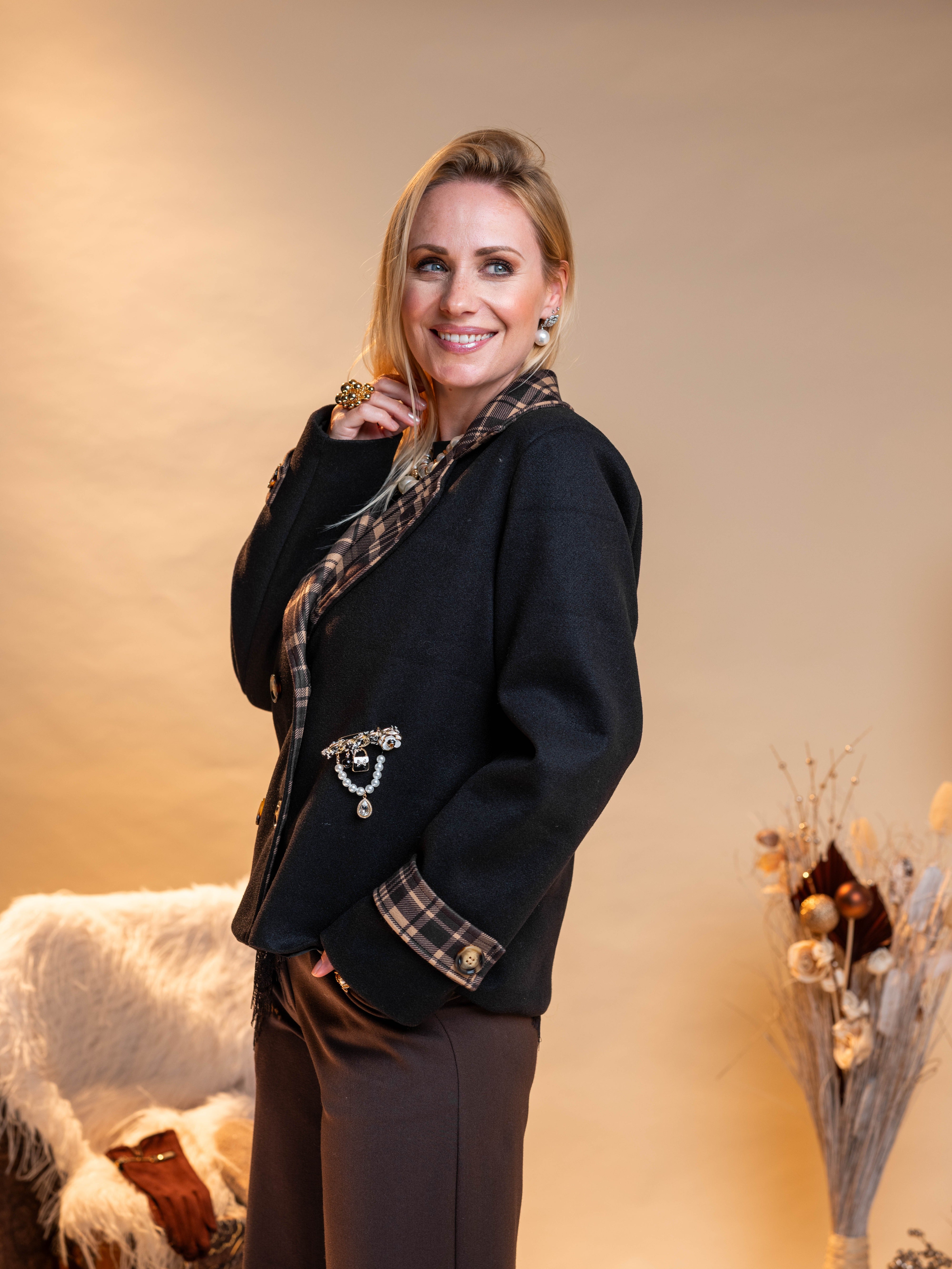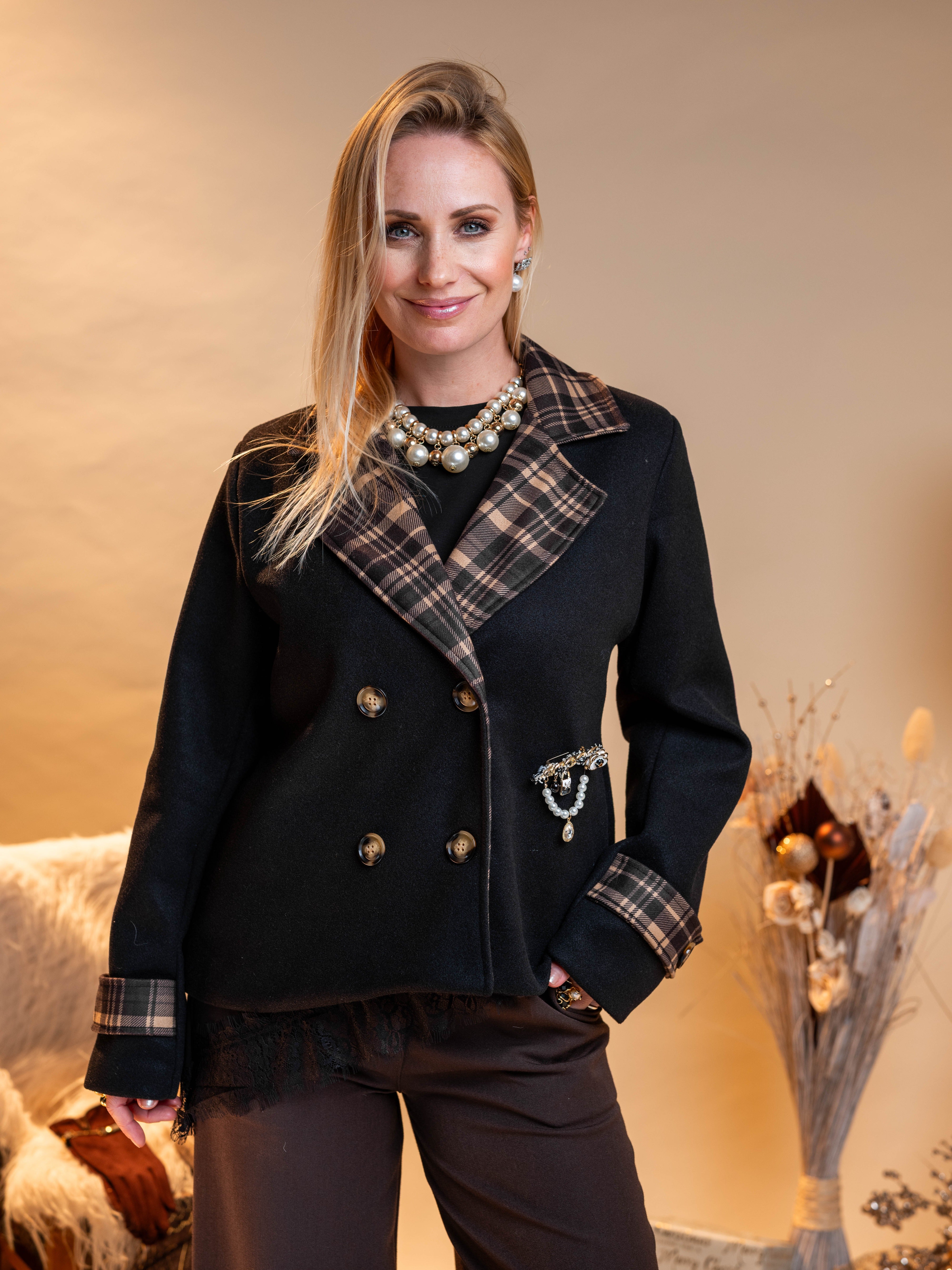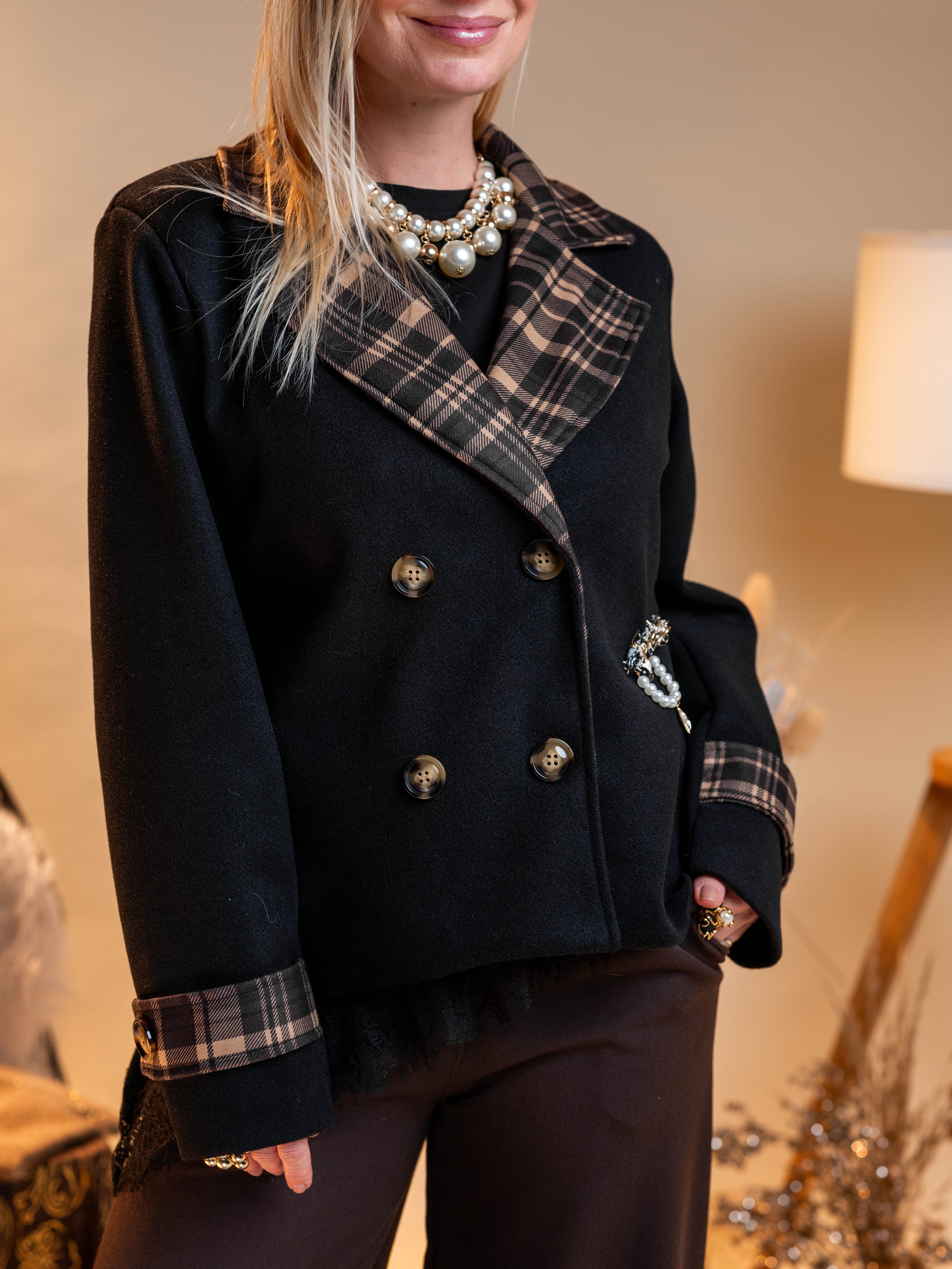 Znižano -30% Obrazec izdelka Kratka črna jakna s karirastim vzorcem €59,50 €41,65 DDV je že vključen v ceno. Količina Dodaj v košarico