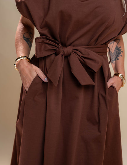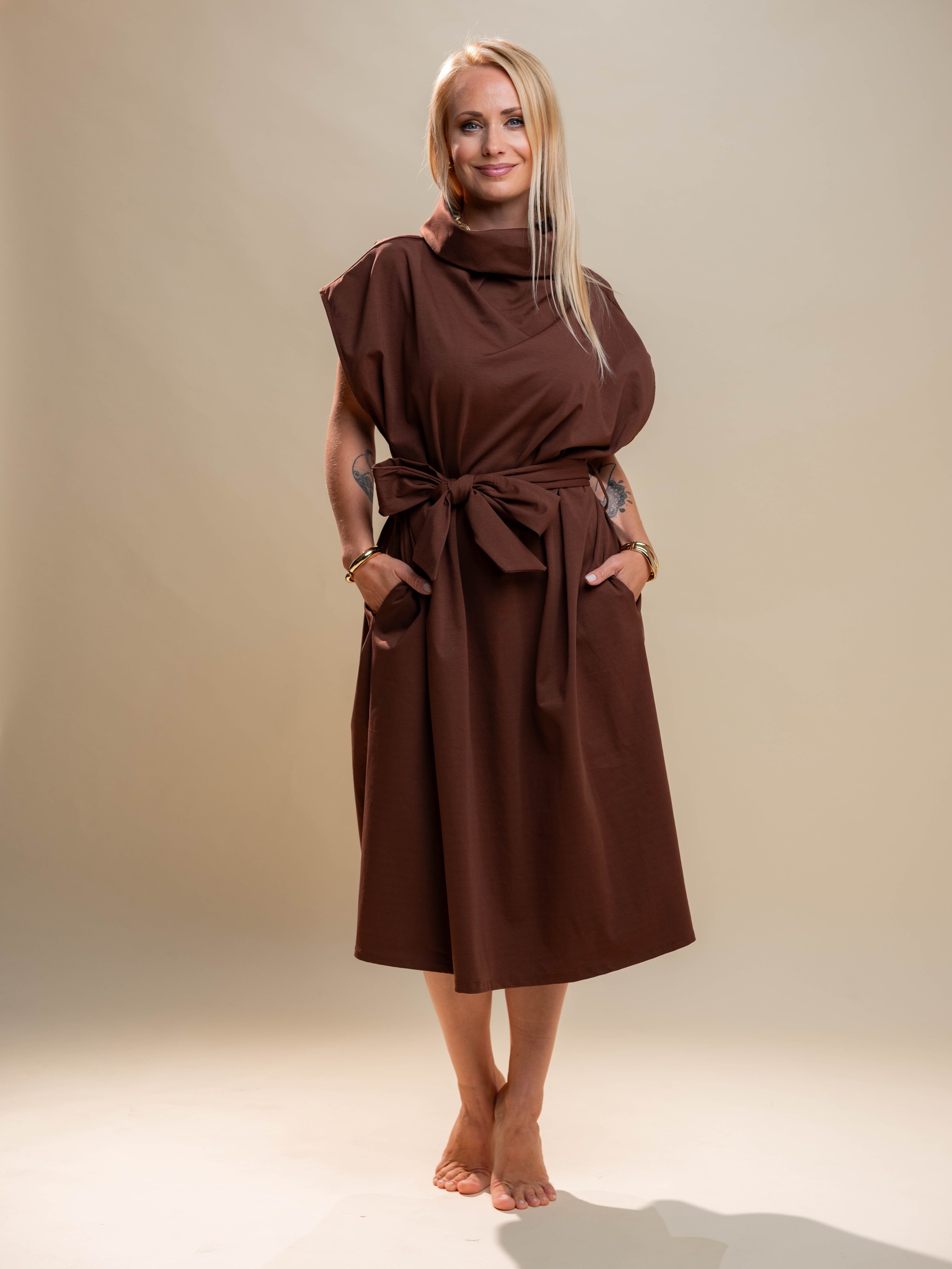 • Rjava obleka s pentljo in žepi