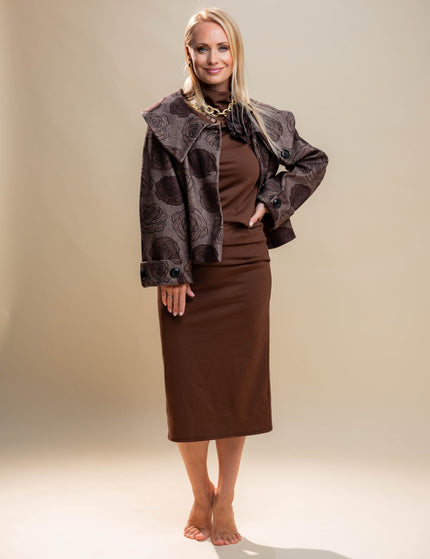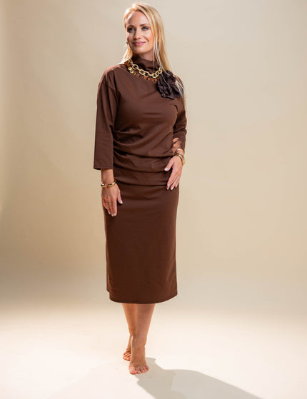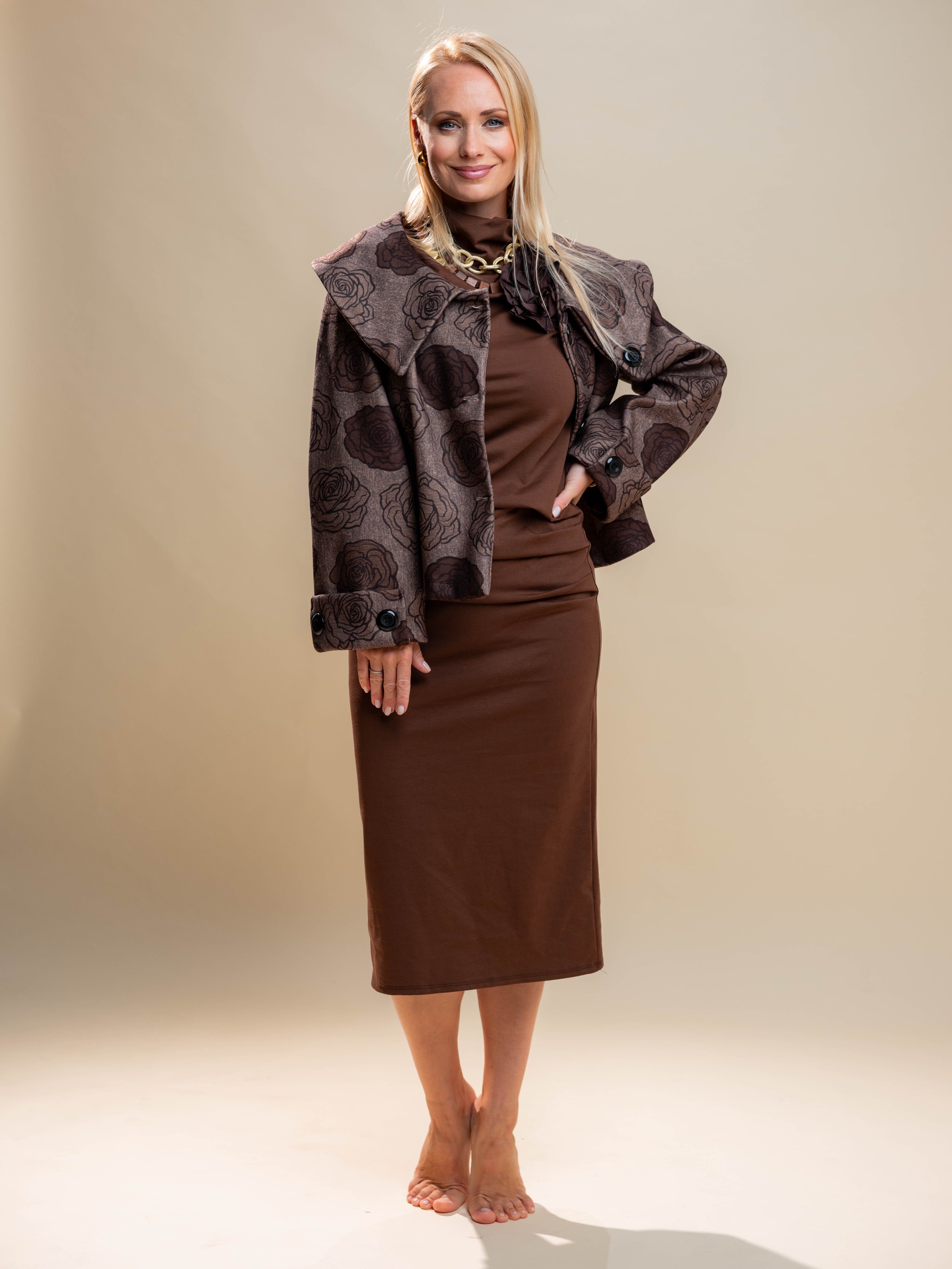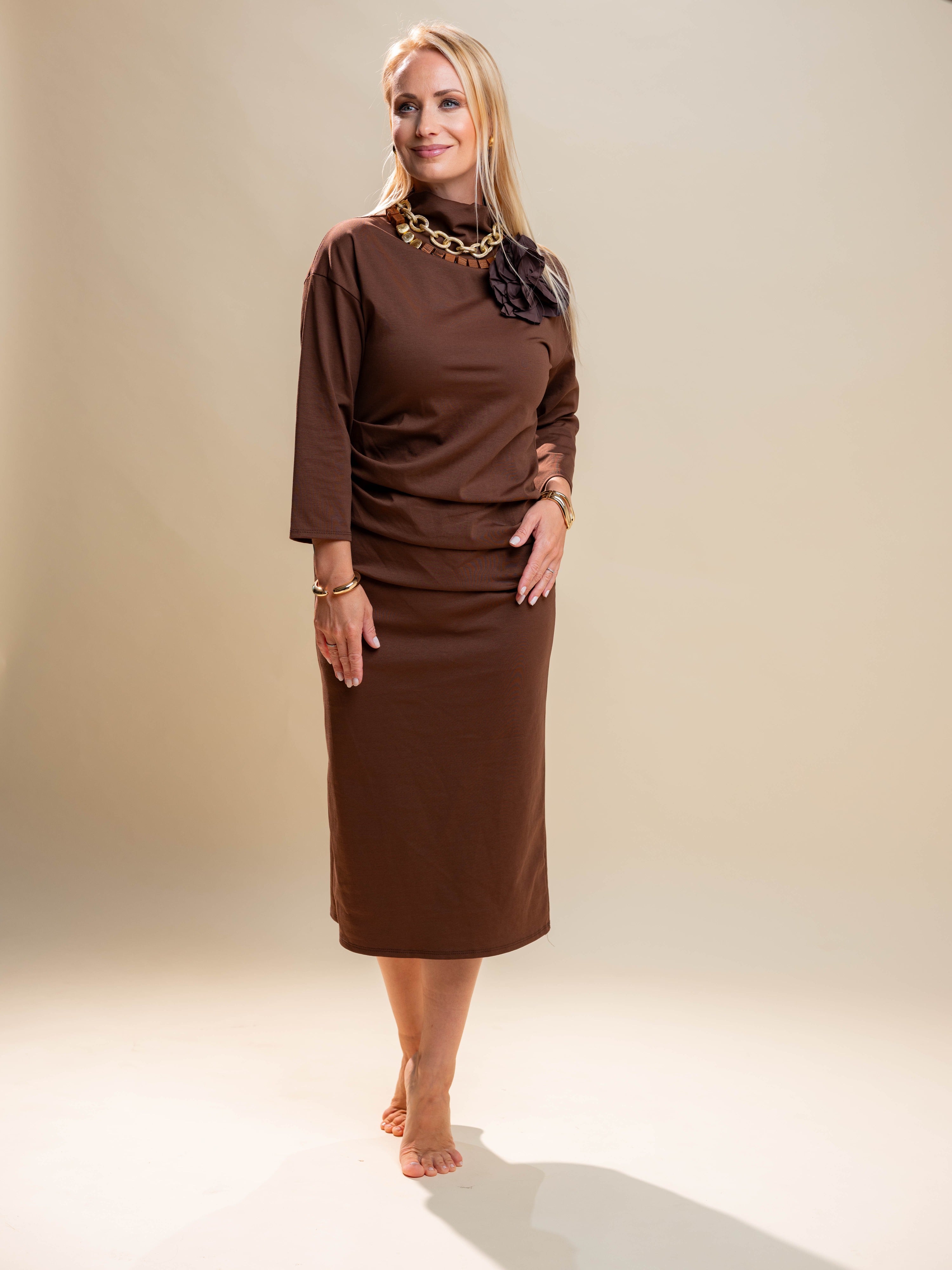 • Rjava obleka s cvetlico in dolgimi rokavi